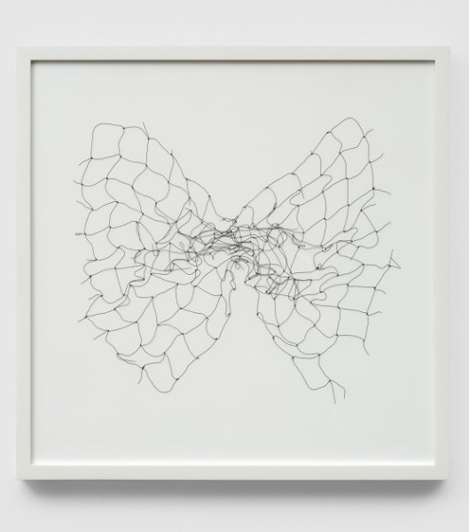 For this work Cornelia Parker melted down a .44 calibre magnum revolver bullet and constructed a net-like grid with the wire from the bullet. The geometric grid has been arranged into a butterfly shape and floats in the space beneath the glass. As a result, the artist has turned a deadly object into the image of something  both fragile and free. From a distance, wire and shadow appear like fine pencil drawings in which the murderous power of their source can no longer be discerned. The grid refers to those used by Minimalist artists such as Agnes Martin, Sol LeWitt or Richard Serra, but confounding the abstract appearance is the fact the grid, by the very nature of its material, is fully 'loaded'.