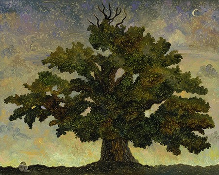 Georg Wilson paintings are drawn from a combination of art history, English folklore, and ecology. With a unique approach to mark-making, her work is full of references to the natural world and careful, contemplative use of colour and texture. Her recent series, The Last Oozings—a reference to John Keats's poem "To Autumn” and inspired by the Pre-Raphaelites - explores Autumn and nature, inhabiting her scenes with human-like figures, insects, and flora. Memory of an Oak I Never Saw is a small painting capturing the majesty of an oak (referred to in folklore as the guardian of the forest) in lush tones and swirling brushstroke. Anchoring the image, and tucked away in the corner of the painting, is a strange creature whose coiled form shelters under the branches of the tree.